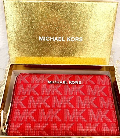 - Style: # 32H1GJ6D0V. Color: LACQUER RED. The small logo wallet is the perfect size for 2 of my smaller jet set bags. The inside has enough space for both cash and cards. The zipper moves easily and allows for full access of the item.