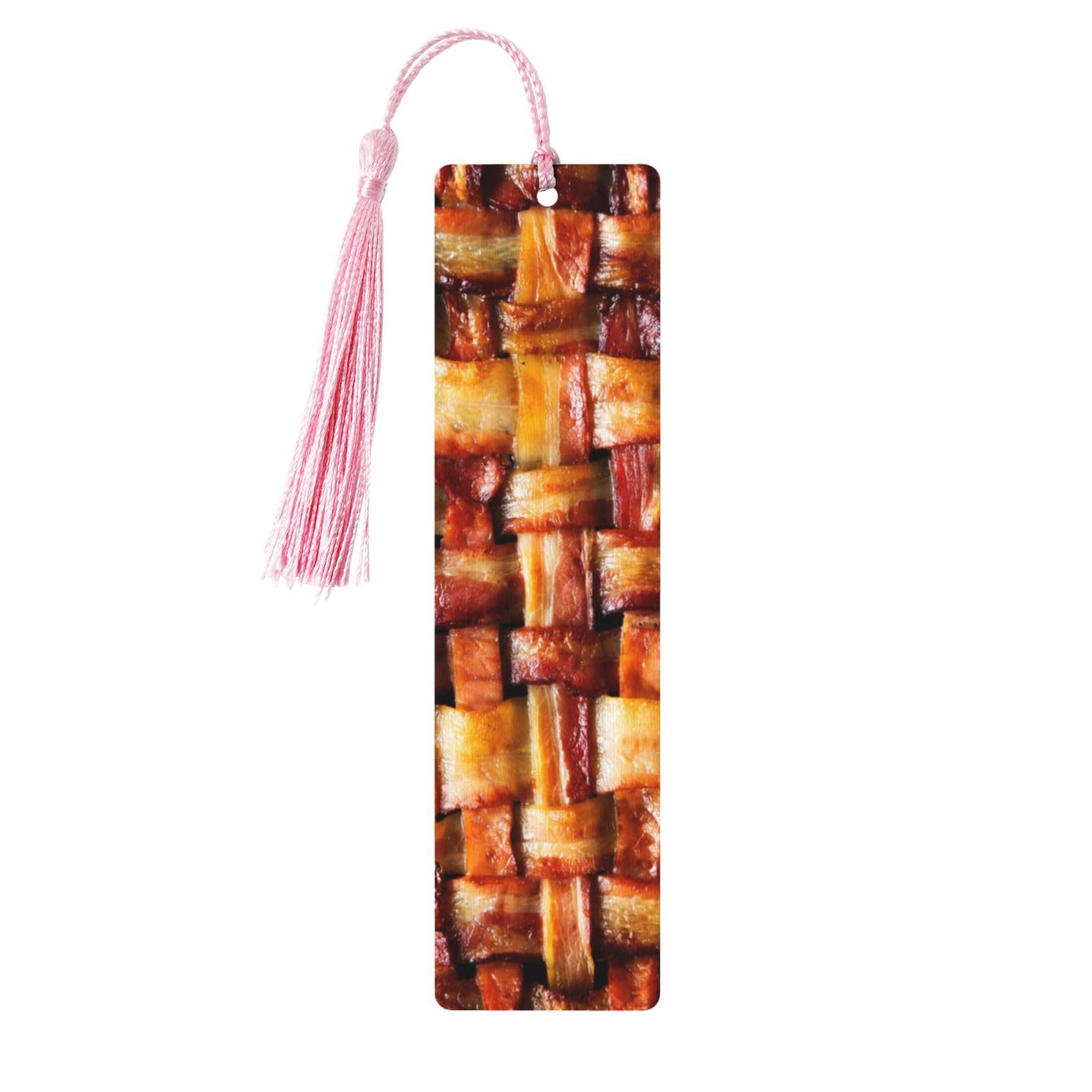 - Mmm . . . bacon! And ''Reading is BACON for the brain.'' Let this fun bookmark remind you that everything is better with bacon, especially books!Diecut to appear like a realistic slice of salted dried meat product, bookmark sizzles with eye-catching gloss highlights.Printed on sturdy, smooth-finish cardstock.A lightly-tinted, marbled orange Lucite-like bead is attached to the bright red tassel.The bookmark is encased in a protective clear plastic sleeve.Measures 2-1/2 inches wide by 7-1/8 inches high.Warning: Choking hazard, small parts. Not for children under 3 years.