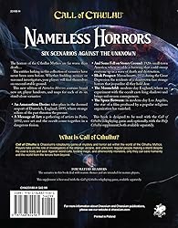 - The horrors of the Cthulhu Mythos are far worse than death... The entities lurking in this collection of scenarios have never been seen before. Whether budding novices or seasoned investigators, your players will find themselves on uncomfortable ground. This new edition of Nameless Horrors contains brand new art, player handouts, and maps for each of its six stand alone adventures. An Amaranthine Desire: takes place in the doomed seaport of Dunwich, England, 1892, where strange echoes of the past threaten the present. A Message of Art: a gathering of artists in Paris, 1893, sees art and the occult come together in a dangerous fusion. And Some Fell on Stoney Ground: 1920s small-town America, where trouble is brewing that could sweep everyone up in a wave of death and destruction. Bleak Prospect: Massachusetts, 1932, during the Great Depression the residents of a shantytown face strange horrors that jeopardize all they hold dear. The Moonchild: modern-day England, where an experiment with the occult casts long shadows and brings unforeseen consequences. The Space Between: in modern-day Los Angeles, the star of a film produced by a popular religious organization has vanished. This book is designed to be used with the Call of Cthulhu roleplaying game and, optionally, the Pulp Cthulhu supplement, both available separately.
