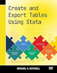- In Create and Export Tables Using Stata, Michael Mitchell teaches you how to expertly craft custom, publication-quality tables of summary statistics, regression results, and more. Mitchell examined hundreds of published journal articles from many disciplines, searching for commonly used table layouts. This book breaks down how to create the most popularly used tables by guiding you through examples using Stata’s table, dtable, and etable commands, as well as the collect suite of commands.This book begins with 24 sample tables, including 6 examples of a Table 1, 8 examples of regression models, 4 examples with Student's t tests, and an example of reporting results from a pretest–posttest design. Each sample table is illustrated step by step, showing you how to create it, customize it, and export it as a Word document. You'll also learn how you can export your table as a PDF or an Excel spreadsheet.After the quick examples, the book takes a more thorough look at the process of creating a Table 1―a table of descriptive statistics that optionally includes a comparison across groups. This discussion also includes extensive instruction on how to create different types of composite results to include in your table; composite results combine multiple statistics into one cell, such as the mean (SE) or median (IQR).Next Mitchell focuses on creating tables from regression models, such as multiple regression, multivariate regression, logistic, and multinomial logistic models, and illustrates how to make tables that combine results from several models.The book ends with a look under the hood, describing what a collection looks like and the steps used by the collect suite of commands for creating a table and filling it in based on the contents of the collection. This information can help you more deeply understand the process of creating tables and help you make more complex tables using Stata.Create and Export Tables Using Stata is integral to anyone reporting data characteristics or analysis. You will learn how to create tables with the layout, formatting, and style you need. Optimize your workflow by using your styles to automate the creation of any future tables. You will take this book off your shelf over and over again as it quickly becomes your go-to reference for creating tables in Stata.