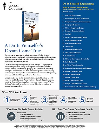 You can confidently tackle a working suspension bridge, airplane, helicopter, catapult, clock, and other technological wonders in your own home workshop. These projects are challenging but achievable. They require only readily available materials and a workshop equipped with common benchtop power tools. Do-It-Yourself Engineering shows how in 17 engaging DIY projects that you create exactly as an engineer does: starting with the concept, working out the design, plunging into construction, and finally putting the final product to the test. Your enthusiastic guide is award-winning teacher Stephen Ressler, a DIY addict and Professor Emeritus from the United States Military Academy at West Point. Using in-studio and in-shop demonstrations, detailed graphics, and 3D computer models, Professor Ressler walks you through the entire process, including the crucial planning phase, which is where most people wonder, “Where do I start?” As you develop your design, he shows how simple high-school mathematics can be used to calculate the loads caused by pedestrians on a bridge, aerodynamic lift developed by an airplane wing, torque in a turbine, and other engineering parameters. Plus, you learn how to apply elementary physics concepts, such as the conservation of energy, Newton’s laws, and Bernoulli’s principle. In addition, Dr. Ressler gives you indispensable shop tips on the use of tools. Above all, he teaches you how to think like an engineer in approaching any problem.