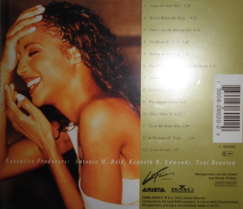Well, it is a La Face record, so of course it has the Babyface stamp all over it--especially on "Let It Flow," also featured on his Waiting to Exhale soundtrack, and "There's No Me Without You." 'Face does step aside, however, to give other producers, songwriters, and artists their time with Miss Braxton, most notably R. Kelly, Diane Warren, Tony Rich, and Kenny G. R&B songbirds in their own right, Shanice Wilson and Chante Moore even show up on backing vocals. The album doesn't quite live up to this overdose of talent; it's too crammed with boring ballads (even if Braxton's low, husky vocals are perfectly suited for them, especially the wrenching watermark of the album, "Un-Break My Heart"). It's when she slips into a sultry groove on "Come On Over Here" and the smash single "You're Makin Me High" that she really shines. --Rebecca Wallwork