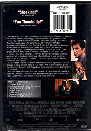 THE INSIDER recounts the chain of events that pitted an ordinary man against the tobacco industry and dragged two people into the fight of their lives. Academy Award(R)-winner Al Pacino (1990 Best Actor, SCENT OF A WOMAN; THE RECRUIT) gives a powerful performance as veteran 60 MINUTES producer Lowell Bergman and Academy Award(R) Winner Russell Crowe (2000 Best Actor, GLADIATOR; A BEAUTIFUL MIND) co-stars as the ultimate insider, former tobacco executive Dr. Jeffrey Wigand. When Wigand is fired by his employer -- one of the largest tobacco companies in America -- he agrees to become a paid consultant for a story Bergman is working on regarding alleged unethical practices within the tobacco industry. But what begins as a temporary alliance leads to a lengthy battle for both men to save their reputations, and much, much more. As they soon find out, Corporate America will use all legal means at its disposal to save a billion-dollar-a-year habit. And as the corporate giants soon find out, Bergman and Wigand are honorable men, driven to smoke out the evidence. Also starring Christopher Plummer (MALCOLM X) as anchor Mike Wallace and Gina Gershon (FACE/OFF), THE INSIDER will chill you with its cold, hard edge -- and thrill you with its unbelievable twists and turns.
