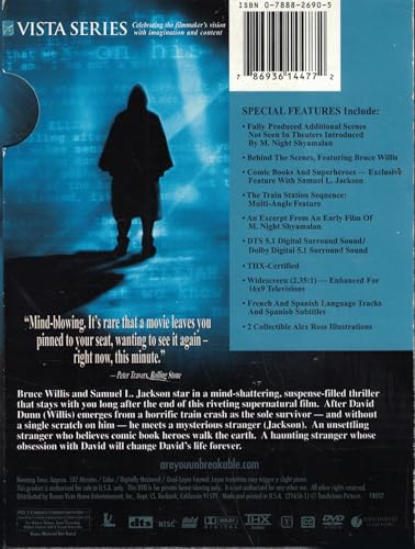 Bruce Willis and Samuel L. Jackson star in a mind-shattering, suspense-filled thriller that stays with you long after the end of this riveting supernatural film. After David Dunn (Willis) emerges from a horrific train crash as the sole survivor -- and without a single scratch on him -- he meets a mysterious sranger (Jackson). An unsettling stranger who believes comic book heroes walk the earth. A haunting stranger, whose obsession with David will change David's life forever.