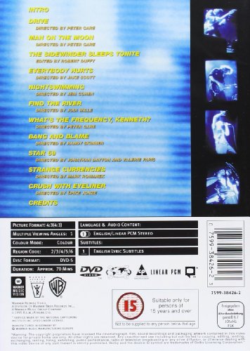 Eleven promos by REM, the biggest 'little' rock band in the world, culled from their latest albums 'Automatic for the People' and 'Monster'. Highlights include singer Michael Stipe hitching a ride in drummer Bill Berry's truck during 'Man On the Moon', the all-human-life-is-here sweep across a traffic jam which accompanies the weepie 'Everybody Hurts' and the Japanese karaoke of 'Crush with Eyeliner'.