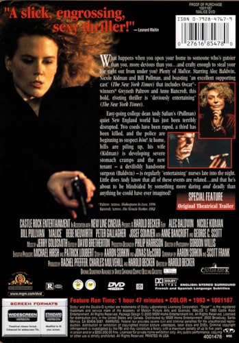 What happens when you open your home to someone who's gutsier than you, more devious than you and crafty enough to steal your life right out from under you? Plenty of Malice. Starring Alec Baldwin, Nicole Kidman and Bill Pullman and boasting an excellent supporting cast (The New York Times) that includes OscarÂ(r) winners* Gwyneth Paltrow and Anne Bancroft, this bold, riveting thriller is deviously entertaining (The New York Times). Easy-going college dean Andy Safian's (Pullman) quiet New England world has just been terribly disrupted. Two coeds have been raped, a third has been killed and the police are beginning to suspect him! At home, bills are pilingup, his wife (Kidman) is developing severe stomach cramps and the new tenanta devilishly handsome surgeon (Baldwin)is regularly entertaining nurses late into the night. Little does Andy know that all of these events are related and that he's about to be blindsided by something more daring and deadly than anything he could have ever imagined! *Paltrow: Actress, Shakespeare in Love (1998); Bancroft: Actress, The Miracle Worker (1962)