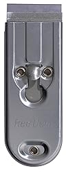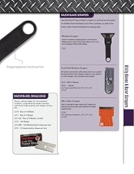 Razor blade scraper Removes paint and stickers from window glass Metal construction All-metal construction Push/pull action locks blade in place All-metal construction Push/pull action locks blade in place Retracts for safe storage of blade Includes one single edge razor blade Replacement blade #3270 (2512-5303)