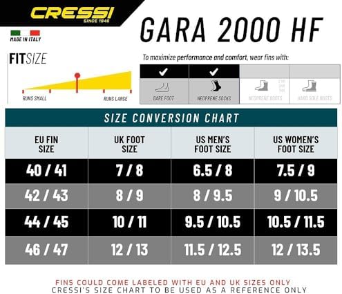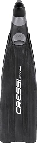 The Gara 2000 HF is a renowned diving fin, pioneering a three-material molding process. Its lightweight yet durable design excels in deep freediving and spearfishing, reaching maximum depths. Featuring the stiffest blade in the Cressi line, this full footpocket fin offers comfort and efficiency with its long, firm blades and built-in stringers and runners. Constructed with multiple compounds, it provides comfort and suppleness in the foot area while maintaining strength and rigidity in the heel and blade area, suitable for wear with or without neoprene socks.