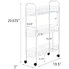 - Three-tier metal utility shelf with white finish for storing supplies in 7 inches of space