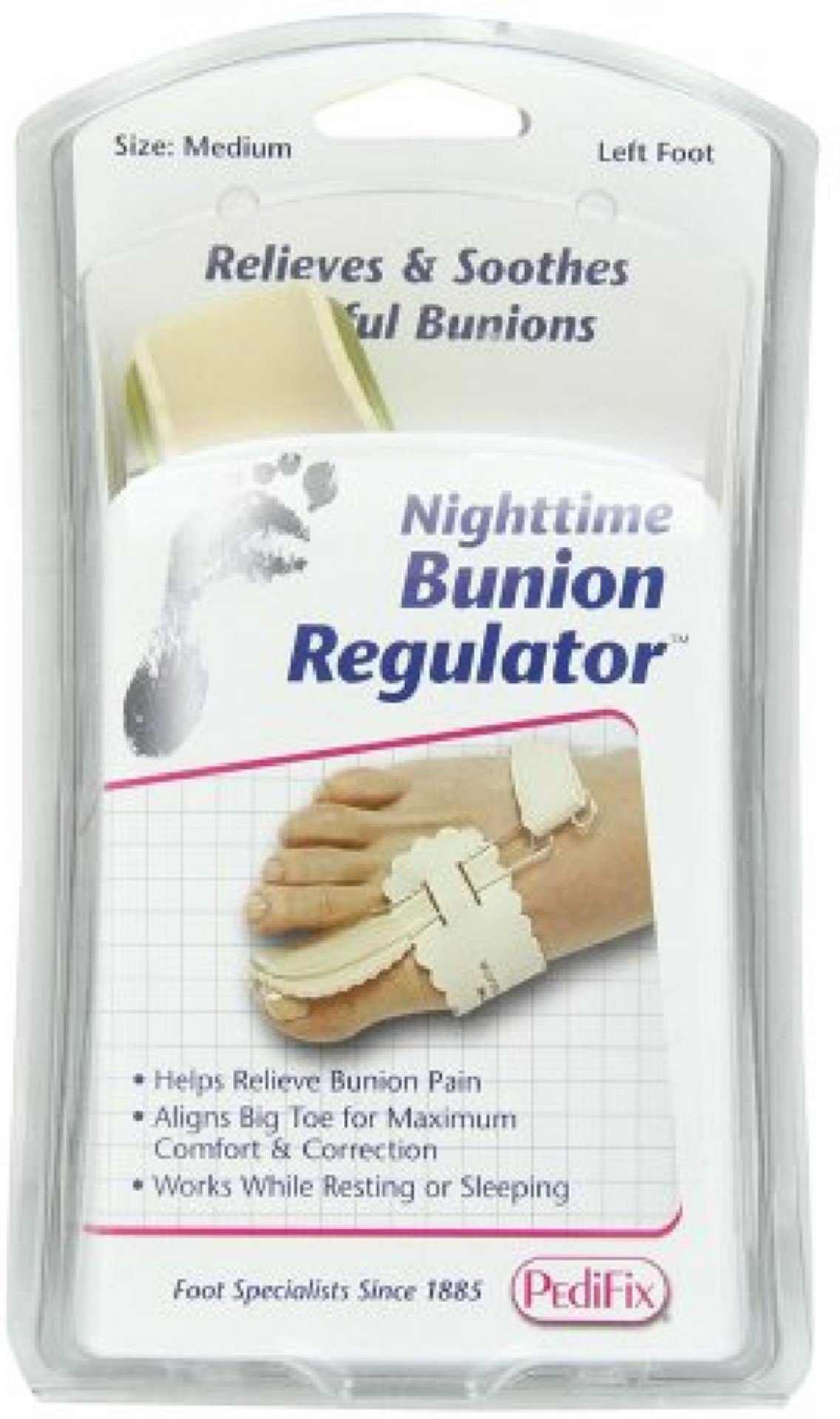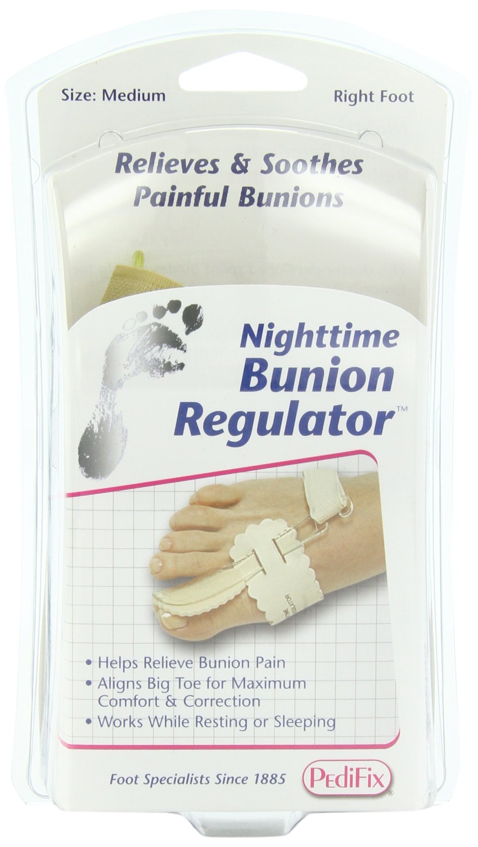 PediFix Nighttime Bunion Regulator, 1 Pack Small Right. The PediFix Nighttime Bunion Regulator Reliever was developed by a physician. It is a bunion splint that guides the big toe back to its proper position. This effective bunion treatment also gently stretches the tendons and muscles to help slow progression of the bunion deformity. The PediFix bunion night splint is often recommended by foot specialists to patients who want to avoid or postpone bunion surgery. Also may be used as a post-surgical splint. This bunion corrector should not be worn while walking or standing. Foam lined, soft padding. Three sizes: Small, Medium, Large. Select Left or Right. One per package.