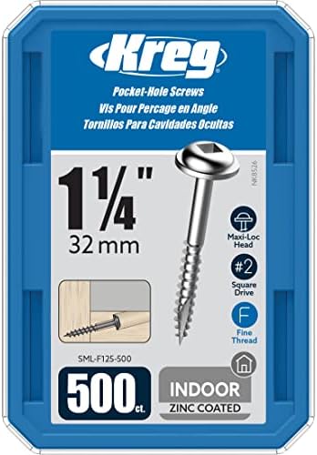 Kreg SML-F125-500 Zinc Pocket Screws, 1 1/4 Inch, 7 Fine Thread, Maxi-Loc Head (500 Count)