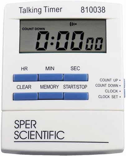 Talking Lab Countdown Timer is a unique and very useful timer featuring a clear pleasant human voice. Eliminate the need to continually visually check time remaining via voice announcements that can be heard from anywhere in the lab. This allows you to concentrate on the experiment you are timing rather than on the timer. In the count-down mode Talking Timer will announce the remaining time every hour. In the final hour it will announce the time remaining every 10 minutes, every minute in the final 10 minutes, and every second in the final 10 seconds. The audible count-down gives you time to return to your experiment and be prepared for the final alarm. A choice of 6 distinctive final alarm sounds makes it easy to identify which Talking Timer has alarmed should you wish to use more than one. Talking Timer is also very useful for work in low light or in the dark where it would be difficult to see a normal timer display. In the CLOCK mode touch any button in the dark and Talking Timer will announce the time. A voice confirms timer and clock settings as you key them in. You also have the option of turning the voice off. Other features include a large 3/4" display with icons to indicate various modes, such as voice off/on, count-down/count-up, etc. Recalls the previous count-down setting for immediate reuse and memorizes another frequently used setting for reuse at any time. Counts up or down to 24 hours. Both functions and the clock work simultaneously. Talking Timer is cleverly designed so that despite its sophisticated features it is very simple and intuitive to use. Has a built in stand for bench top use, clips to a pocket, or sticks to any metal surface with a magnetic back. Button cell batteries are included. N.I.S.T. traceable certificate of compliance available. Dimensions: 3¼ x 2½ x 1" Weight: 2.2 oz.
