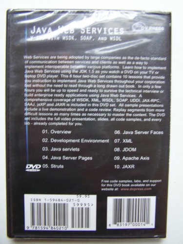 Web Services are being adopted by large comanies as the de-facto standard of communication between services and clients as well as a way to implement interopability between various platforms. Learn how to implement Java Web Services using the JDK 1.5 as you watch a DVD on your TV or laptop DVD player. This 8 hour two-disc set contains 10 lessons that provide you instructioun to implement Java Web Services throughout your corporation fast without the need to read through a long drawn out book. In only a few hours you will be up to speed and ready to survive the technical interview or build enterprise ready applications using Java Web Services. A comprehensive coverage of WSDK, XML, WSDL, SOAP, UDDI, JAX-RPC, SAAJ, jaXP and JAXR is included in this DVD set. All samples presentations include a live demonstration and a code review. Replay segments from more difficult lessons as many times as necassary to master the content.