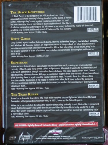 Four fast-paced action features: The Black Godfather, Dirty Games, Slipstream, and The Train Killer.