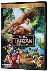 - Swing into action and adventure with Disney's original classic, TARZAN(R), packed with fun-filled bonus features and award-winning music such as the memorable "You'll Be In My Heart" and "Trashin' The Camp." Disney's magnificent animated adaptation of Edgar Rice Burroughs's story of the ape man begins deep within the jungle when baby Tarzan is adopted by a family of gorillas. Even though he is shunned as a "hairless wonder" by their leader, Tarzan is accepted by the gorillas and raised as one of their own. Together with his wisecracking ape buddy Terk and neurotic elephant pal Tantor, Tarzan learns how to "surf" and swing through the trees and survive in the animal kingdom. His "Two Worlds" collide with the arrival of humans, forcing Tarzan to choose between a "civilized" life with the beautiful Jane and the life he knows and loves with his gorilla family. Filled with humor, heart, and hilarious fun, TARZAN(R) is an unforgettable adventure you'll watch again and again.~~TARZAN(R) Owned by Edgar Rice Burroughs, Inc. And Used by Permission. TARZAN (C) Edgar Rice Burroughs, Inc. and Disney Enterprises, Inc. All Rights Reserved.|With 47 previous movie adaptations, TARZAN(R) is said to be the second most-filmed subject in Hollywood history (topped only by DRACULA) and one of the all-time most popular with moviegoers.|To help prepare them for the film, the directors and a group of artistic supervisors set out on an African safari in March 1996, touring the animal reserves in Kenya, visiting the mountain gorillas in Uganda, and observing Bwindi's Impenetrable Forest.|The city of Tarzana is named after "Tarzan" author Edgar Rice Burroughs' 550-acre Tarzana Ranch, which he later sold to housing developers.|Reportedly, Burroughs was never satisfied with the various screen versions of his book, but according his grandson Danton Burroughs, the Disney version would have pleased his grandfather.