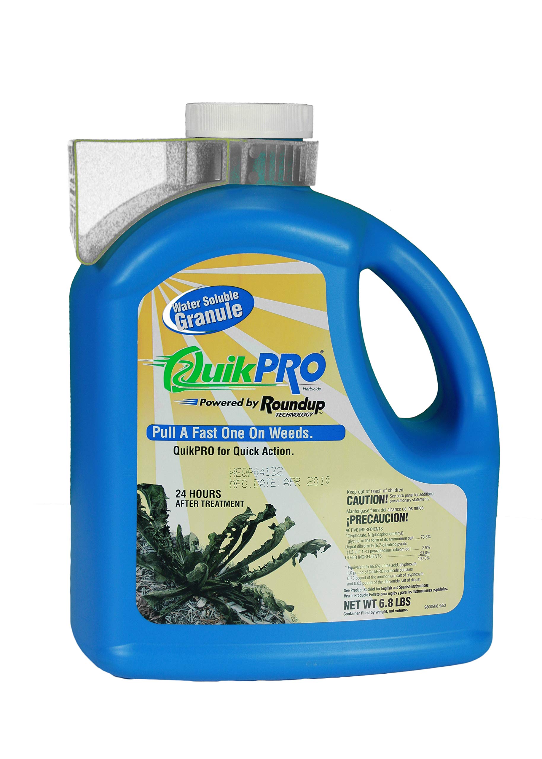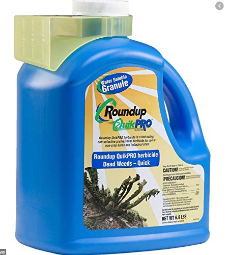 This QuikPro non selective herbicide jug has ingredient glysophate, which lands onto the weed or grass and is absorbed directly into the weed, not the ground. The addition of diquat, along with the surfactant, gives you even faster burndown. It controls broadleaf and grass weeds, or woody brush and trees, roots and all. Comes in 6. 8 pounds jug.