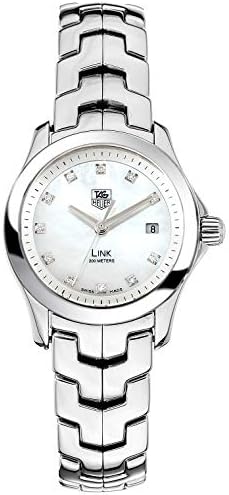 This TAG Heuer Women's Link Diamond Watch offers precision, reliability, and elegance. This classy timepiece has a 27-millimeter stainless steel case, a stationary, stainless steel bezel, and a matching stainless steel band that features a reliable fold-over clasp with safety mechanism. Sparkling stones and standout black minute indexes adorn the white mother-of-pearl dial, which is encased in a scratch-resistant-sapphire window, and a handy date calendar rests at the three o'clock position. Powered by quartz movement, this watch is water resistant up to 660 feet.