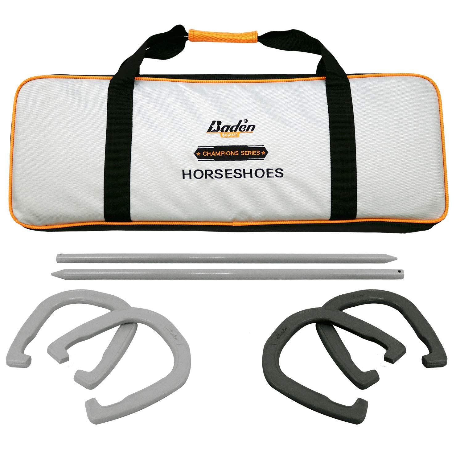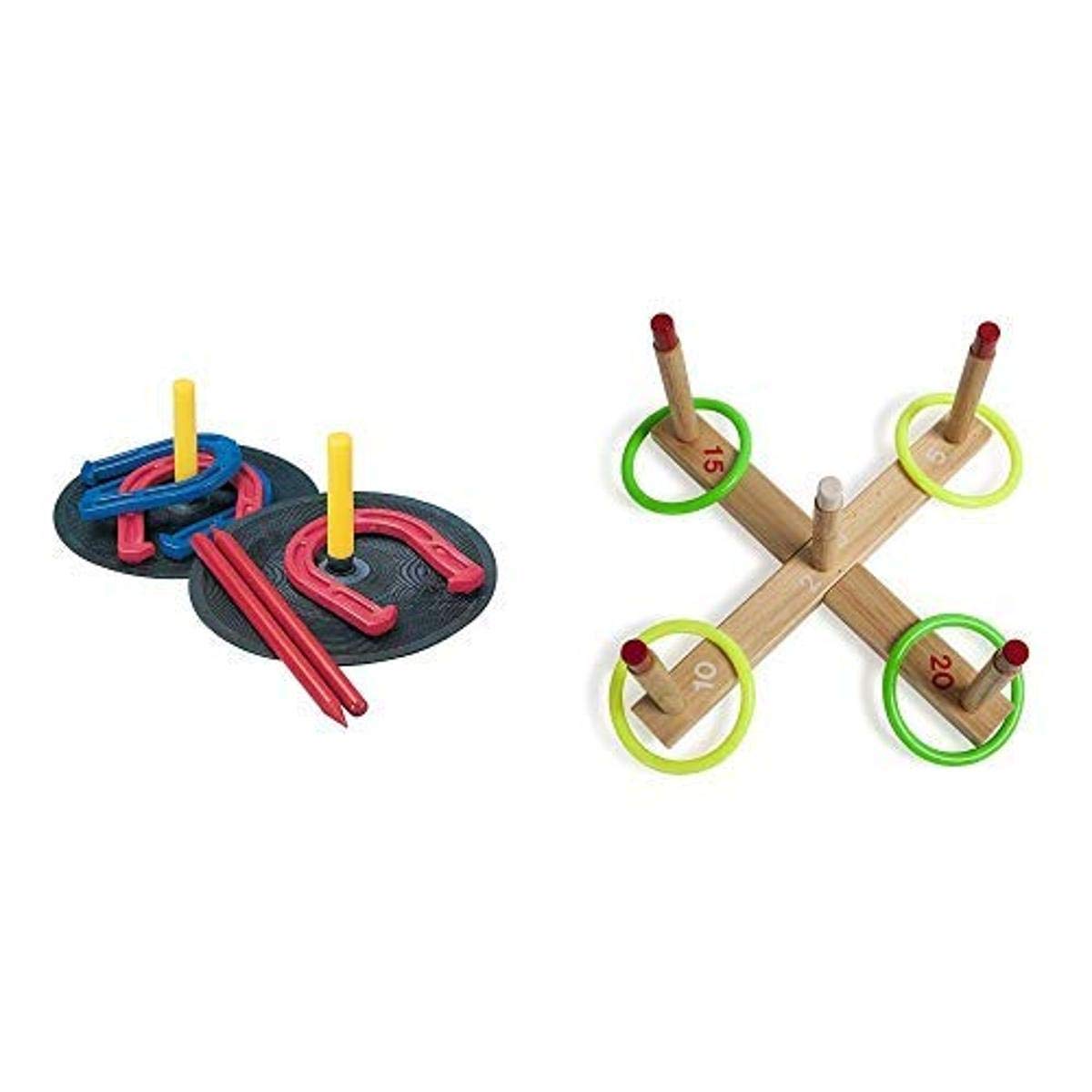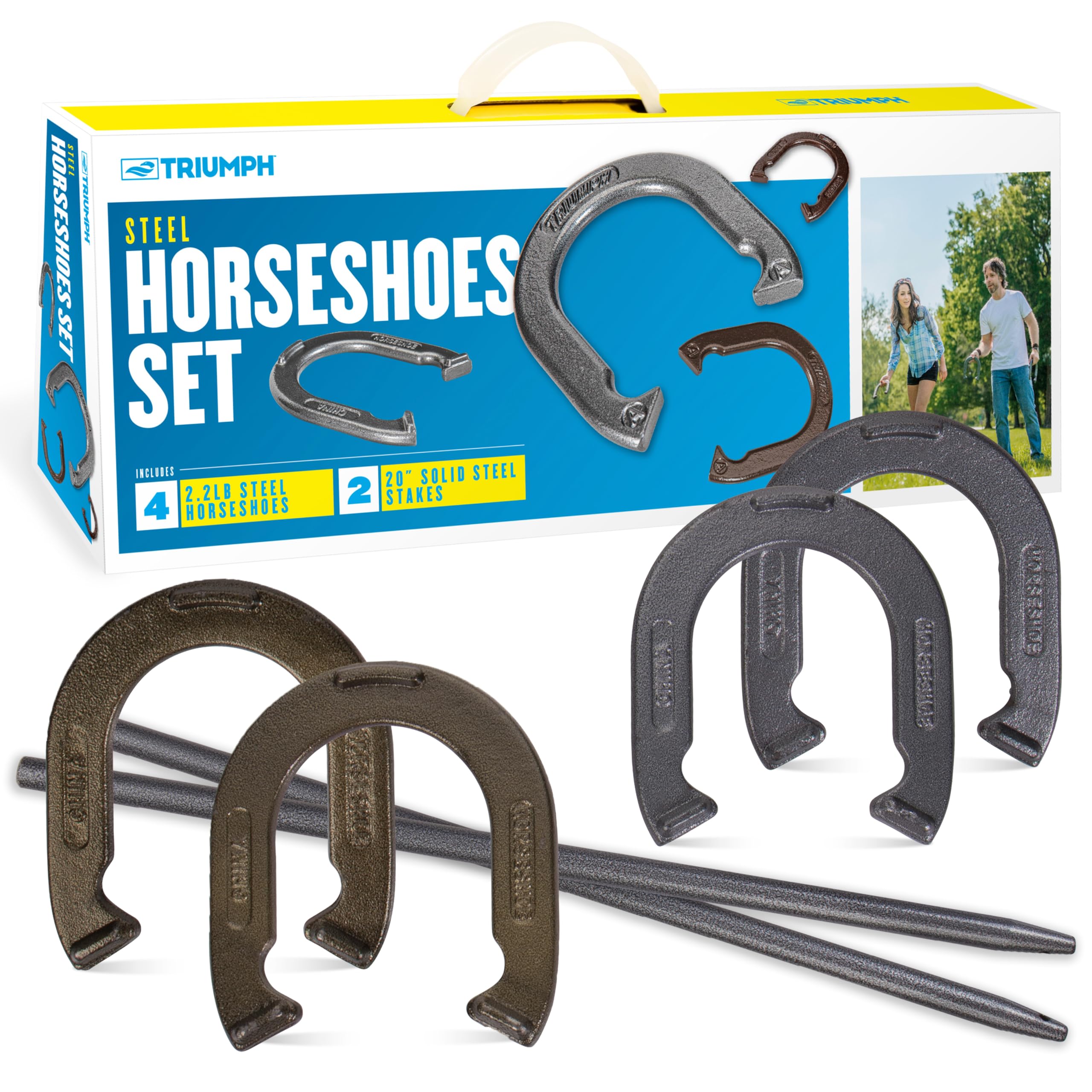 • Everything you need to play: With 4 horseshoes, 2 rubber mats with center pegs, and 2 red plastic dowels, this horseshoe set comes with everything needed to start a game in your backyard, on the playground, or in the gym
