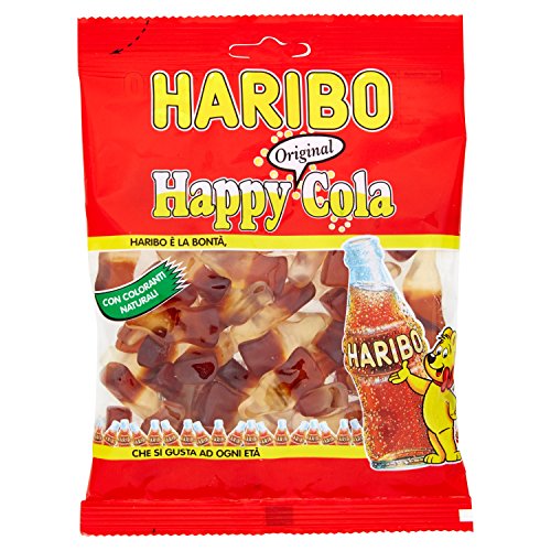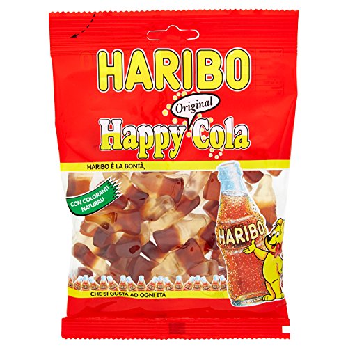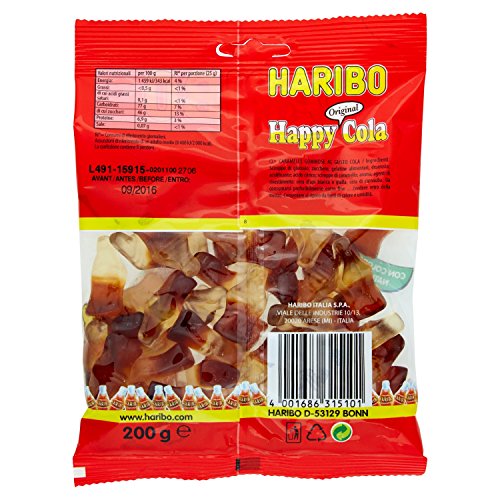 Enjoy the delicious Happy Cola gummies in 2 toned fruit gums in a bottle shape in a cola flavor. Ingredients: glucose syrup; Sugar; Gelatin; dextrose; Acidifier: citric acid; Caramel syrup; Aroma; Coating agent: beeswax white and yellow, carnauba wax. May contain traces of milk, wheat. Nutrition facts per 100gCalorific value: 343.00 kilocalories (kcal) calorific value: 1.459,00 kilojoules (kJ) fat: 0.50 fat, of which saturated fats: 0.10 carbohydrates: 77.00 carbohydrates, of which sugar: 46.00 protein: 6.90 Salt: 0.07 Allergy Information:May contain traces of: cereals containing gluten and gluten containing cereals, wheat and wheat products (gluten-containing cereals), milk and milk products (including lactose) Manufacturer_Contact:HARIBO GmbH & Co. KG Hans-Riegel-Strasse 1 53129 Bonn (D) Nutritional information, allergens and listed ingredients may change without notice. So please read the product label before use and for any question, please contact us