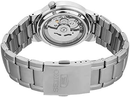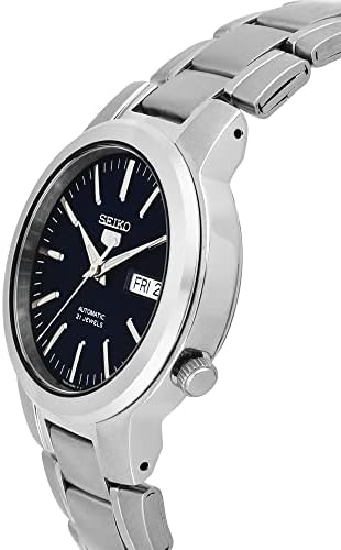 El Reloj Seiko 5 Automático para Hombre con Dial Azul de Acero Inoxidable cuenta con un movimiento automático japonés de alta tecnología oculto detrás de un estilo analógico clásico. El preciso movimiento automático japonés de 21 rubíes mantiene este reloj funcionando sin batería: se alimenta automáticamente con el movimiento de tu brazo. Esta característica de alta tecnología está escondida detrás del dial azul del reloj, que cuenta con manecillas luminosas de tono plateado y marcadores de hora en forma de barra. El dial también tiene una ventana de fecha en la posición de las tres en punto, y todo el dial está protegido por un cristal mineral. Todo esto se mantiene seguro en tu muñeca gracias a una pulsera de enlace de acero inoxidable que se cierra con un cierre de seguridad de doble botón plegable. Otras características incluyen una caja de acero inoxidable y resistencia al agua hasta 99 pies (30 metros).