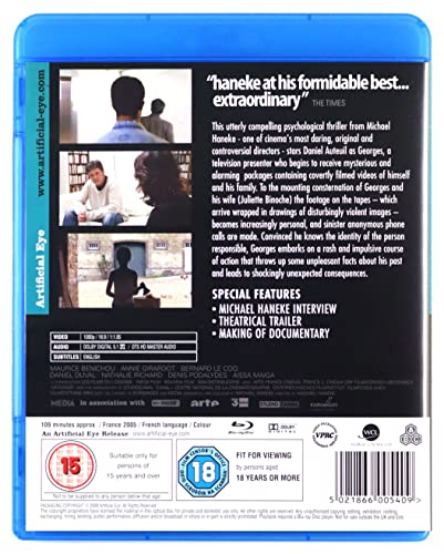 Import only Blu Ray/Region All pressing. Acclaimed French thriller from writer-director Michael Haneke. Georges (Daniel Auteuil) is a successful TV presenter, happily married to Anne (Juliette Binoche). Their idyllic, middle-class life is suddenly derailed when Georges starts receiving tapes through the post, from someone who has been secretly filming him and his family as they go about their daily business. Gradually the tapes become more intimate and personal, suggesting that the perpetrator is someone who knows Georges well. With the police unable to help, Georges and Anne find their comfortable existence gradually unravelling into paranoia and mistrust.