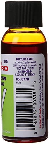 Certified A/C Pro Engine Cooling Systems UV Dye is an engine coolant UV dye for leak detection. Includes one application of radiator/engine cooling system UV leak detection dye. Safe for use in all vehicle makes and models (except 1996 and newer GM models that use DEX-COOL coolant). Compatible with all types of anti-freeze except GM DEX-COOL coolant.