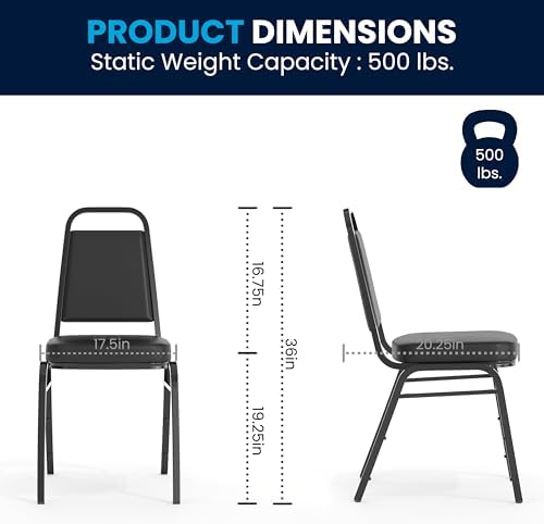• Stacks up to 10 chairs high, bumper guards protect black powder coated finish, 16 gauge steel frame holds up to 500 lb. weight capacity