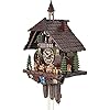 A cuckoo clock with a typical Black Forest House with a hand-carved roof, a bell tower, a chimney and hand-painted Gentian and Sunflowers. The parents kiss in time to the cuckoo call, which is once on the half hour and on the full hour according to the time. Two alternating melodies - Edelweiss and Happy Wanderer - play every hour. Meanwhile the siblings rock happily on the see-saw and the water wheel turns. The figurines on the balcony, who are wearing the Black Forest costume, dance around to the music. The clock is personally signed at the back by the manufacturer Adolf Herr . His signature guarantees the experience of 7 generations of clock-workmanship. This clock comes with a certificate of authenticity (AHC). Clock Movement: 8-Day(weekly wind-up) Regula rack strike movement with night off. Clock-Face: HerrZeit Wooden dial, diameter 4 Inch (10 cm), with wooden hands. Dancing Figurines: Handcarved and handpainted wooden couples in Black Forest costume. Pendulum: HerrZeit bolt pendulum with fine adjustment. Musical Movement: musical movment (22 tones) with two different melodies (Edelweiß & The Happy Wanderer). Chime: Diameter 4,7 Inch (12cm), burnished Cuckoo-Bird: HerrZeit cuckoo bird (handcarved). Color: walnut dark. Publication Year: 2004 Designer: Juergen Herr