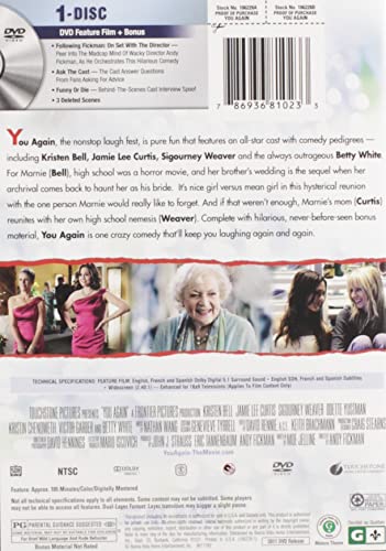 You Again, the nonstop laugh fest, is pure fun that features an all-star cast with comedy pedigrees - including Kristen Bell, Jamie Lee Curtis, Sigourney Weaver and the always outrageous Betty White. For Marnie (Bell), high school was a horror movie, and her brother's wedding is the sequel when her archrival comes back to haunt her as his bride. It's nice girl versus mean girl in this hysterical reunion with the one person Marnie would really like to forget. And if that weren't enough, Marnie's mom (Curtis) reunites with her own high school nemesis (Weaver). Complete with hilarious, never-before-seen bonus material, You Again is one crazy comedy that'll keep you laughing again and again.