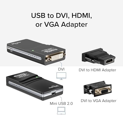 - Compact and Portable: The Plugable USB Display Adapter easily fits in any backpack or laptop bag, similar in size to a pack of playing cards; no external power adapter required; supports various display connections and includes DVI to HDMI adapter and DVI to VGA adapter for VGA cable