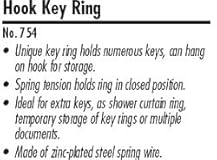 Unique key ring holds numerous keys, can hang on hook for storage Spring tension holds ring in closed position Ideal for extra keys, as shower curtain ring, temporary storage of key rings or multiple documents Made of zinc-plated steel spring wire 1-1/2″ dia. (top) x 2-3/4″ (length) Supplied 100 per box