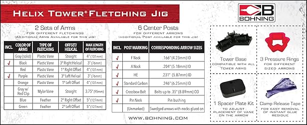 - The Bohning Tower Jig has been the most efficient fletching machine on the market since 2006. The helix tower jig comes with all the components you need to fletch any style of vane in a 3 degree right or left configuration. The included rings allow for consistent pressure that cannot be obtained with magnetic jigs. All tower jig arms can be wiped with acetone to make cleanup a breeze.