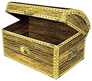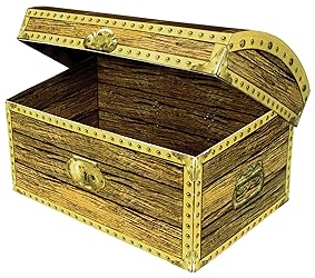 - Beistle 3-D Treasure Chest Box Ahoy, matey! Set sail on a high-seas adventure with this Treasure Chest Box, a must-have decoration for any pirate-themed party, treasure hunt or Halloween event. Designed to resemble a classic wooden pirate chest, this realistic printed cardstock paper box features a wooden plank pattern, gold rivet detailing, and a lock accent, making it the perfect centerpiece for your celebration. Whether you’re hosting a birthday party, fun activity, themed event or scavenger hunt, this decoration adds an element of fun and excitement. Measuring 8 inches by 5.5 inches by 5.5 inches once assembled, this lightweight treasure chest offers plenty of room to hold party handouts, candy, small gifts, or pirate loot, enough booty for all your buccaneers to find. Crafted from printed cardstock paper, the double-sided graphics on both the top and bottom ensure an eye-catching, high-quality design from every angle. The chest comes in two separate parts with 6 brass fasteners for simple assembly and a secure structure. Easy to set up and perfect for activities, themed events, pirate-themed décor and more. Pair it with pirate hats, gold coin decorations, and skull-and-cross bone props for a complete themed look that will wow your guests and enhance your party atmosphere!