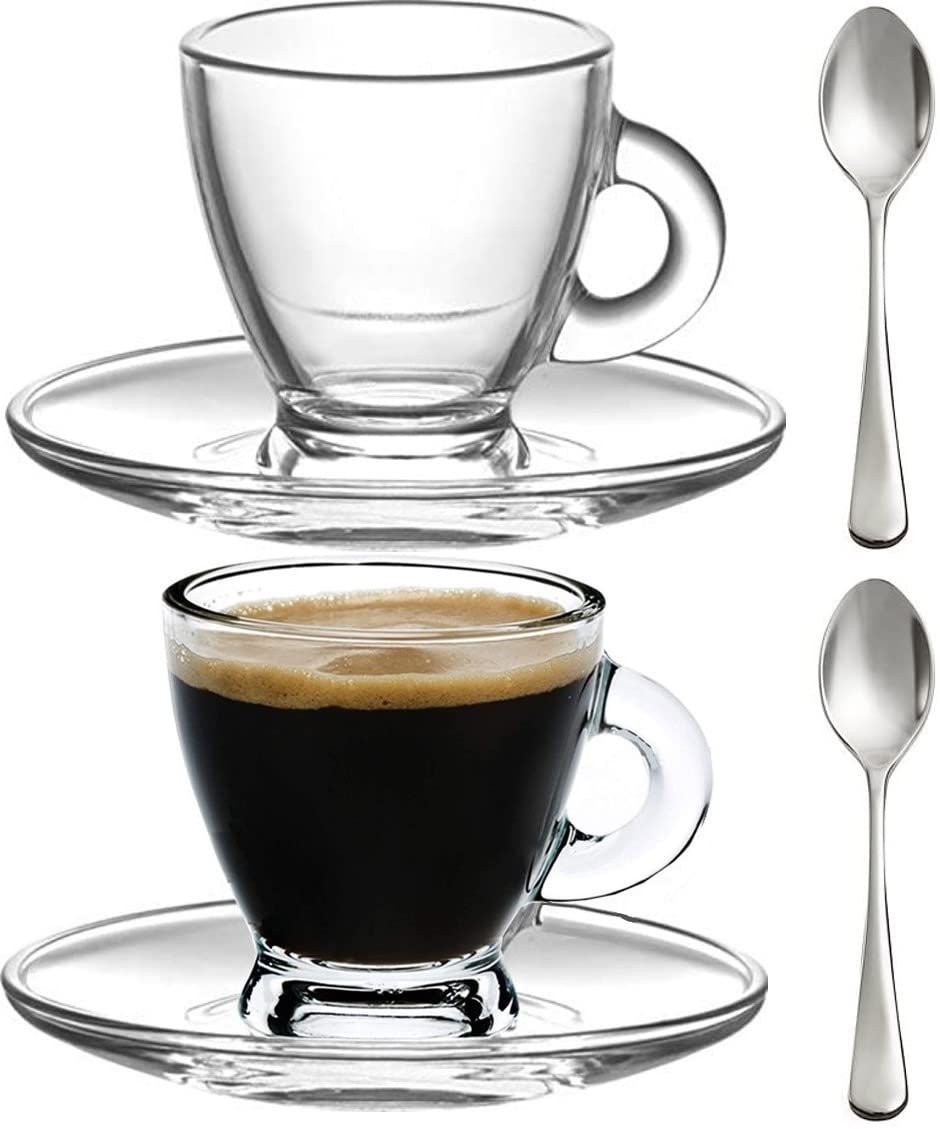 Set of 2 Espresso cups (2.7 oz.) in tempered glass and 2 saucers Both cups and saucers are dishwasher safe.