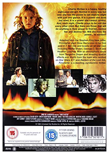 Charlie McGee is a happy, healthy eight-year-old girl. Normal in every way but one: she has the power to set objects alight with just one glance. It is a power she does not want. It is a power she cannot control. And, each night, Charlie prays to be just like every other child. But there are those that will do anything in their power to find her, control her and destroy her. Will she have the power... to survive? Adapted from the Stephen King best seller, Firestarter stars Drew Barrymore in her first post E.T. film role and boasts an all-star cast including Martin Sheen, George C. Scott and Heather Locklear. With an atmospheric score from Tangerine Dream and amazing special effects and stunts from the team who worked on Star Wars, E.T. and Raiders of the Lost Ark, Firestarter is a dazzling, pyrotechnic thriller.