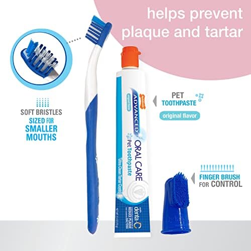 Our Advanced Oral Care Puppy Dental Kit helps your pup establish strong oral hygiene from the start! The angled soft dog toothbrush with gentle bristles was designed to clean between your pup's teeth and promote a happy, healthy smile. Formulated with Denta-C, the puppy dog toothpaste helps reduce plaque and tartar for more effective preventative dental care. Plus, your dog will love its delicious original flavor. Slip on the finger brush to easily remove excess plaque and food debris. Vet recommended and pet parent approved, our puppy toothbrush kit makes dental care simple and convenient!