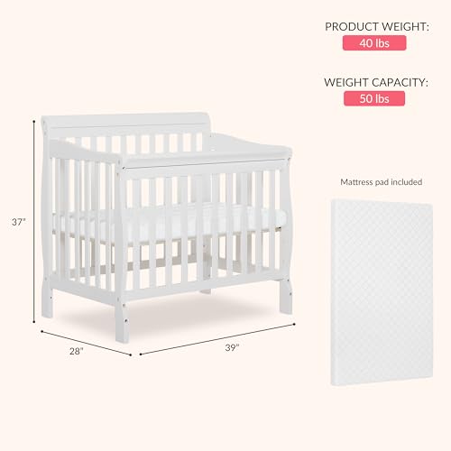 - Includes a 1” mattress pad for added comfort and fits any Dream On Me Greenguard Gold Certified mini crib mattress. The crib with attached changing table measures 39"L x 28"W x 37"H, offering a reliable and space-saving solution for your nursery.