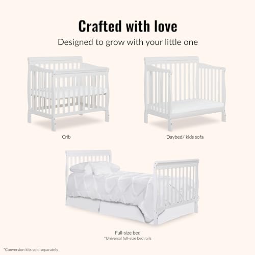 - 4-in-1 Convertible Mini Crib – Grows with your child from infancy through toddler years into childhood, easily converting from a mini crib to a mini daybed and a twin-size bed with and without footboard (conversion kits sold separately), delivering long-lasting value and versatility