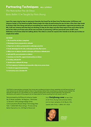 ABOUT THE TEACHER: Finis Jhung performed with the San Francisco, Robert Joffrey, and Harkness ballets, on Broadway, and in film, before founding his own Chamber Ballet U.S.A. Now, he is a master ballet teacher, the creator of more than 50 instructional dance videos, and the author of The Finis Jhung Ballet Technique: A Guide for Teachers & Students. ABOUT THE VIDEO: Learn the ropes, step by step, to everyone's favorite, the Grand Pas de Deux from The Nutcracker. Griff Braun and Johanna Snyder of The American Ballet Theatre begin the video by performing the pas de deux. After that, they break it all down with Finis Jhung and tell you everything you need to know about promenades, supported pirouettes, and lifts. Griff and Johanna tell what they are thinking as they do the steps and what they expect from each other. By the end of the video you'll have seen all the nuts and bolts of partnering. Griff has partnered some of ABT's best ballerinas, so speaks with the voice of experience. This video is a must for anyone who intends to do this pas de deux or simply loves ballet. SECTIONS are listed on the back cover of the DVD image above.