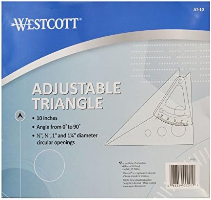 Westcott Adjustable Triangular Scale is made of clear transparent plastic. Westcott 10 Inch triangle ruler is adjustable which permits tracing of angles from 0 to 90. This drawing ruler has inner graduations on arc which give degrees of one angle while the outer row of figures gives the degrees of the complimentary angle. The transparent finish of these scales allow you to view through the page while you draw or work on an assignment. These clear rulers have 1/4 Inch, 1/2 Inch, 3/4 Inch, and 1 Inch circular openings for easy angle measurements. Westcott focuses on creating innovative designs that provide style and quality to an assortment of school, craft, and office products which are perfect for your drafting and drawing needs.
