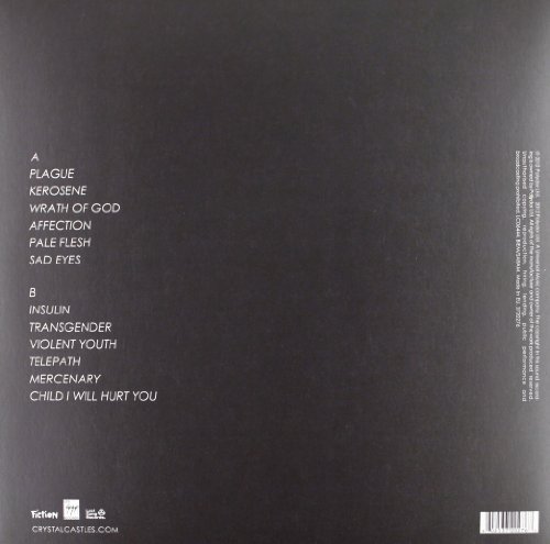 Vinyl LP pressing. 2012 release, the third album from the Canadian Electronic/Experimental band, the first of their albums to be produced entirely by band member Ethan Kath. ''We wanted the album to sound like a completely different and new experience'' says Ethan. ''We'd limit ourselves to one take on each song because we believe the first take is the rawest expression of an idea,'' By ditching their old synthesizers and keyboards used on I and II, Ethan enforced a 'strictly no computers' rule in the studio and began recording everything directly to tape. Together the Canadian duo has conjured up a collection of songs that are as raw as they are well rounded. As '(Ill)' unfolds, each track will take you to greater heights and equal lows, as you enter the sometimes plagued and often polarized world that is Crystal Castles. Recorded mostly in Warsaw and Berlin, the album also boasts the haunting and euphoric 5-minute mind-bender 'Plague' that quickly caused a cyber-storm amongst fans and media when the band unveiled it via their soundcloud page this summer.