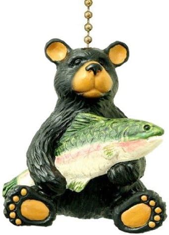 Add a touch of the outdoors to any room with this black bear ceiling fan pull. The decorative fan pull is approx 2.5" tall and made of highly detailed sculpted resin. The 6-inch chain and connector attaches easily to your existing fan pull chain. This 3D ceiling fan pull features a hungry black bear holding a fish.