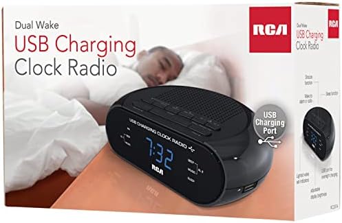 RCA USB Charging Clock Radio, .6” Blue LED Display, Brightness Display, FM Radio with Presets, Dual Wake, Sleep Timer, and Snooze Functions