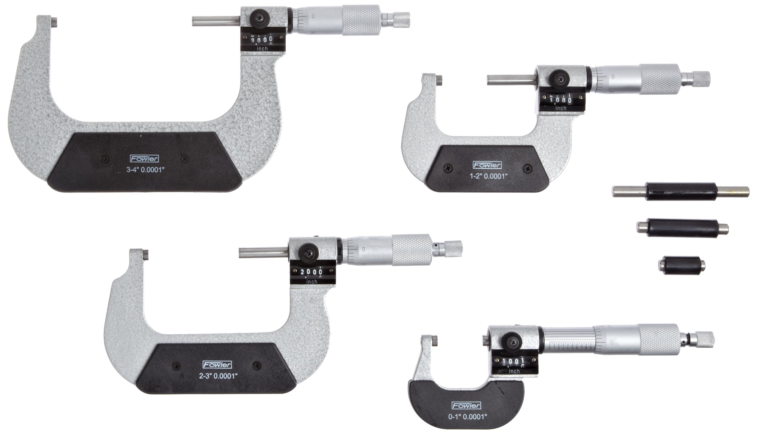 The Fowler 52-215-006-1 vernier micrometer set has six micrometers with a 0 to 6" measuring range and a 0.256" diameter flat anvil/spindle pair for general purpose measuring. The Vernier scale has 0.0001" graduation intervals and 0.00016" accuracy (up to 2") for precise and accurate readings. The anvil/spindle have hardened, precision-ground, and micro-lapped carbide measuring faces with 0.00003" flatness and 0.00005" parallelism for accurate measurements. The positive locking lever on the spindle locks measurements in place for accurate readings and the zero adjustment on the sleeve ensures accurate measurements. Friction and ratchet style thimbles apply constant measuring force for repeatability between users. Friction-style thimbles are suitable for one-handed operation and stop turning when the spindle comes into contact with the workpiece, providing constant force for consistent measurements between operators. The ratchet-stop thimble provides an audible sound and stops the spindle from turning when the spindle comes into contact with the workpiece, providing constant force for consistent measurements between operators. A satin chrome finish on the thimble and sleeve helps reduce rust and glare, providing long life, and microfine graduations help ensure accurate readings. The set includes six micrometers with 0 to 1", 1 to 2", 2 to 3", 3 to 4", 4 to 5", and 5 to 6" measuring range; 1", 2", 3", 4", and 5" standards, wrenches, and a fitted plastic case. Micrometers are precision measuring instruments that use a calibrated screw to measure distances. These measurements are translated into large rotations of the screw that are then able to be read on a scale . Micrometers are typically used in manufacturing, machining, and mechanical engineering. There are three types of micrometer: outside, inside, and depth. Outside micrometers may also be called micrometer calipers, and are used to measure the length, width, or outside diameter of an object. Inside micrometers are typically used to measure interior diameter, as in a hole. Depth micrometers measure the height, or depth, of any shape that has a step, groove, or slot.The Fred V. Fowler Company manufactures inspection and measuring instruments such as electronic indicators, calipers, bore gages, and micrometers. The company, founded in 1946, is headquartered in Canton, MA.