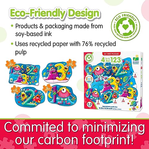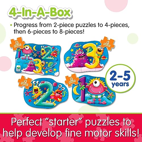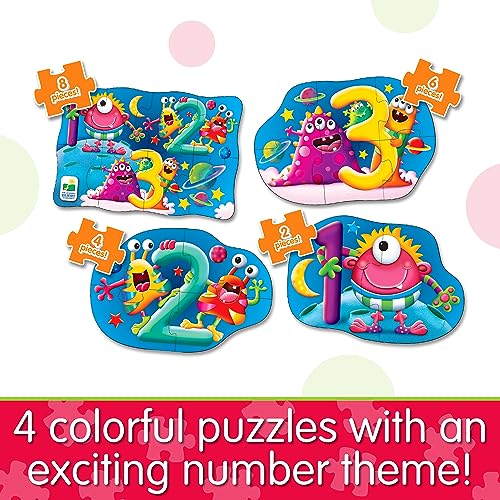 - KEY FEATURES - These four vibrantly illustrated puzzles are perfect for toddler hands to manipulate and are great for both BOYS and GIRLS ages 2 and up. This set includes one 2-piece puzzle, one 4-piece puzzle, one 6-piece puzzle and one 8-piece puzzle. The progressive puzzles are designed to introduce number, counting, and problem-solving, plus boost early communication skills. The increased number of pieces per puzzle challenges little minds. Complete the final 8-piece puzzle to collect all the counting creatures! THE SPECS: Made of thick, durable cardboard construction - 20 pieces total.