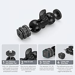 【Wide Application】A universal double ball head with cold shoe and 1/4’’ screw on both ends, and can be widely used with a monitor/small action camera/LED Lights/microphones/flash when shooting 【180 Degree Rotation】The ball mount can be easily rotated by 180 degrees and secured by the side wingnut for a perfect viewing angle 【Easy to Lock】the locking knob is used for securing and operating the ball head faster 【Comes with Shoe Base】The ballhead comes with a shoe base, which could mount on a camera cage/handle/plate, or directly on cameras such as or Canon, for Nikon, for Olympus, for Pentax, for Panasonic, for Fujifilm & for Kodak. 【NOTICE】not recommend for monitor or LED light over 1.0 kg/2.2 lbs.