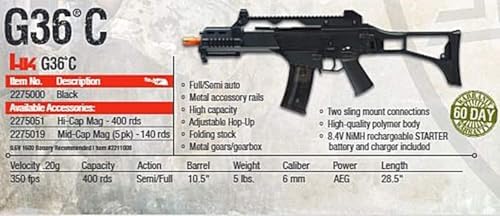 The HK G36C Competition Series Airsoft Rifle offers both full and semi automatic shooting as well as AEG. A high torque motor and high-quality polymer fiber body contribute to an overall solid performing airsoft gun. The high capacity mag allows for 400 rounds to go in at once. This is Officially licensed! Don't be fooled by the imitators! The full metal gears and metal gearbox are powered by an 8.4V NiMH rechargeable battery and charger (included). Licensed Trademark of Heckler & Koch GmbH