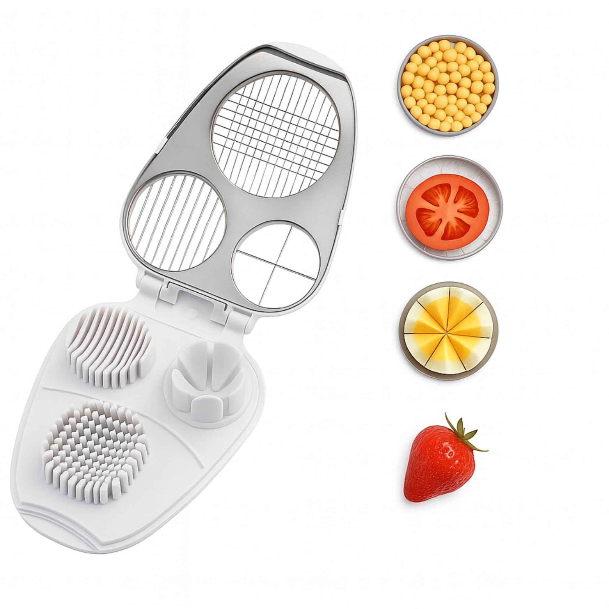 - Holder cradles egg in two directions for round or oblong slices