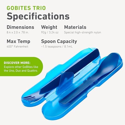 The GoBites Trio is the civilized travel utensil set that's equally at home in the break room or the backcountry. The low-profile storage case keeps things clean during transport, and the lightweight, durable utensils will stand up to years of abuse. The Trio tools are designed with eating in mind - comfortable to hold but robust enough for serious eating. The knife blade has sharp serrations to cut a piece of chicken and the fork tines are long enough to twirl spaghetti. There are no hidden nooks and crannies where food can build up, so GoBites are a breeze to keep clean. Handy touches like an included toothpick and a metal bottle opener embedded in the knife round out the set. The Trio utensils are made from high-temp nylon that's incredibly strong. The case is made from food-safe #5PP. All parts are BPA-free, PC-free, Phthalate-free, and dishwasher safe (top rack).