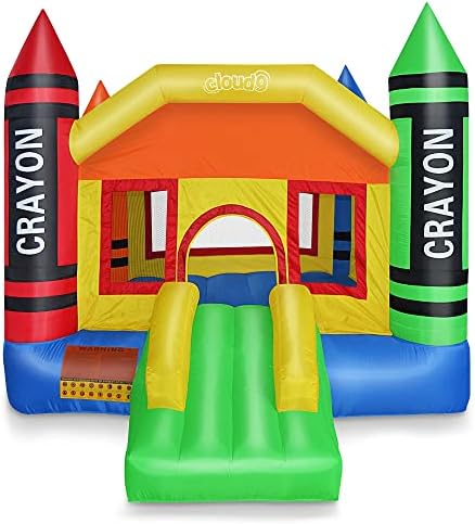 The Cloud 9 inflatable Mini Crayon bounce house is destined to become one of the favorite, kid's toys, delivering endless playtime to bounce, slide, and play make-believe at birthday parties, family reunions, holiday celebrations, summer backyard gatherings, and more. This bouncer is perfectly sized to provide enough interior space to bounce freely and comes with handy ground stakes for quick and secure setup outdoors. The charming mini crayon design has been carefully crafted to ensure safety. Constructed of heavy-duty, fire-resistant, puncture-proof 420D nylon, this bouncer has met lab testing requirements for compliance with the Lead-Free Toys Act. Bouncer inflates in less than two minutes and deflates quickly, and folds up easily for storage. For less than the cost of renting and using once, you can own this affordable jump house for multiple entertainment opportunities for the kids! For even more fun, add balls (not included) to create a bouncy ball pit. Inflated bouncer measures approximately 12' front to back including the entry/exit slide, 9' (wide) x 7' 6" (tall) with a capacity of 3 children (100 pounds or less each). Includes: inflatable bounce house, instructions, ground stakes and tear patch kit. Caution: Always use GCFI-protected receptacles/circuits and take caution to keep blower and power cords in dry locations. Do not use in windy or other inclement weather. Make sure bounce house is secured to the ground prior to use outdoors. Not intended for commercial use.